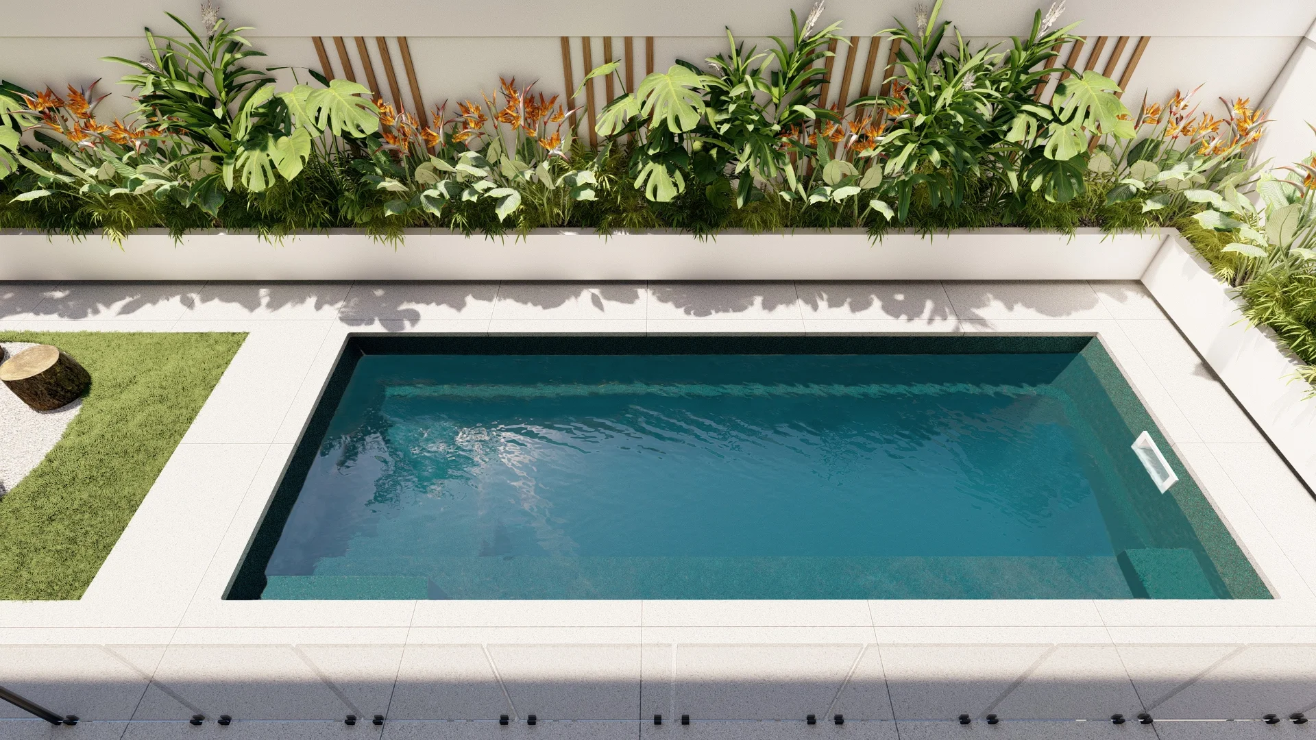 Its narrow design is a testament to ingenuity, tailored to fit comfortably into smaller areas without compromising on impact or functionality. Dual access points enhance the pool’s accessibility to the full-length bench seat that stretches from entry point to entry point. Steps cascade down into the shallow end, inviting swimmers into an unobstructed swimming corridor.